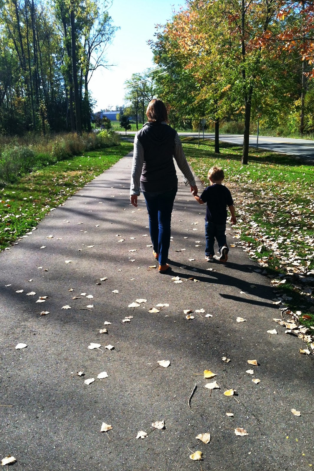 Last Friday, the boys and I went to the library. William made a friend who introduced him to the computer station. It took Will no time to familiarize himself with the programs and was soon playing an educational Dora game. Alex also enjoyed the nursery rhymes. On Saturday, we had our Grand Rapids friends down for a "tailgate" for the U of M game. It was great to see everyone and the kids had so much fun playing in the driveway and running throughout the house. On Sunday, we hiked the natural trails across the street from our neighborhood (next to the Boy Scout camp). We had some beautiful fall weather today and we were able to rake our first mini pile of leaves.